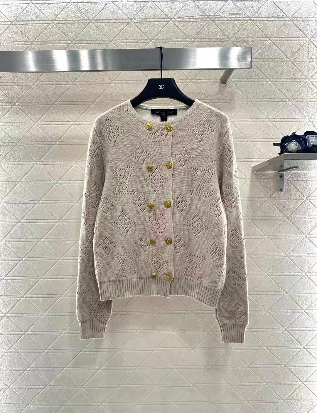 Woven from cashmere and wool yarn, with a premium texture and comfortable softness, this round neck shoulder long sleeved knitted cardigan features a double breasted design with hollowed out textures outlining letter logos and clover elements, complementing each other in a fashionable and charming manner, highlighting a gentle temperament. The edges are all tightened with elasticity, highlighting a high-end tone. The regular silhouette decorates the body, making it a simple and versatile piece for all seasons.